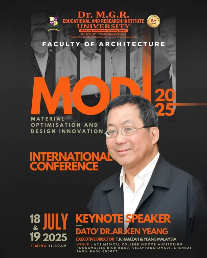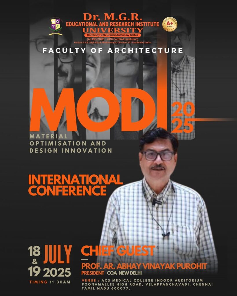 The MODI 2025 International Conference – Material, Optimization and Design Innovation for a Sustainable Future marked a remarkable milestone in advancing knowledge, innovation, and sustainability. Hosted by the Faculty of Architecture, Dr. M.G.R. Educational and Research Institute, the conference brought together thought leaders, researchers, and professionals from across the world.