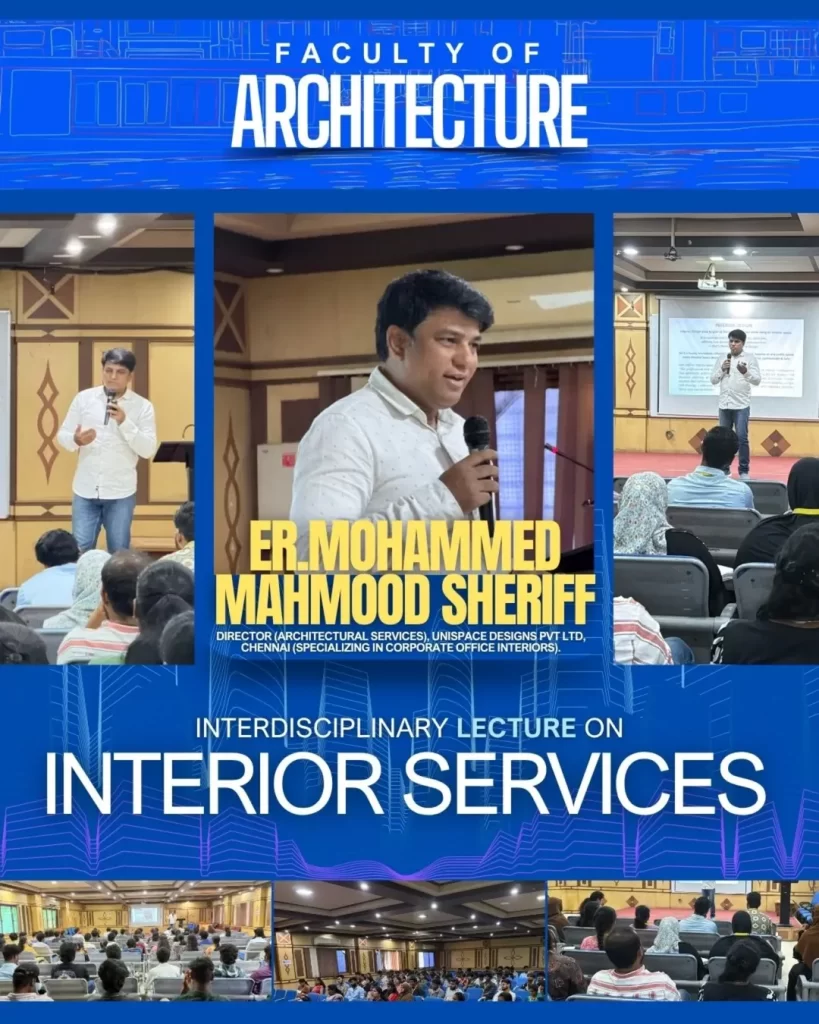 An inspiring Expert Talk on Interior Services was conducted at the Faculty of Architecture, Dr. M.G.R. Educational and Research Institute, led by Er. Mohammed Mahmood Sheriff, Director (Architectural Services) at UNISPACE Designs Pvt. Ltd., Chennai.